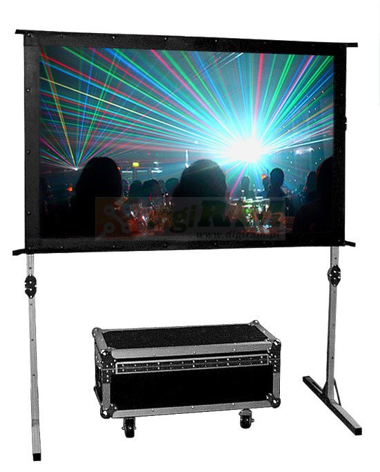 - Wygodna, czarna walizka na kółkach ułatwia transport i przenoszenie ekranu