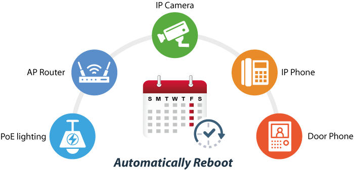 IXT-900-1X1UP umożliwia podłączonym kamerom IP PoE lub bezprzewodowym punktom dostępowym PoE ponowne uruchomienie o określonej porze każdego tygodnia. Zmniejszy to ryzyko awarii kamery IP lub punktu dostępowego wynikającego z przepełnienia bufora.