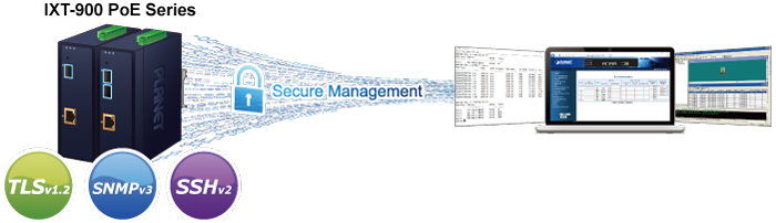 IXT-900-1X1UP jest wyposażony w ulepszone funkcje cyberbezpieczeństwa, które odpierają cyberzagrożenia i ataki. Obsługuje protokoły SSHv2, TLSv1.2 i SNMPv3, aby zapewnić silną ochronę przed zaawansowanymi zagrożeniami. Dzięki temu przesyłanie danych do krytycznego sprzętu klienta w sieci biznesowej jest bardzo bezpieczne. IXT-900-1X1UP chroni zarządzanie siecią i zwiększa bezpieczeństwo sieci o znaczeniu krytycznym bez ponoszenia dodatkowych kosztów lub wysiłku związanego z wdrożeniem.