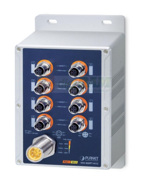 PLANET ISW-808PT-M12 to przemysłowy, solidny i odporny na wibracje przełącznik PoE+ do szerokiego zakresu zastosowań w fabrykach lub pociągach w ruchu, ponieważ gwarantuje niezawodne działanie w warunkach wibracji i wstrząsów.