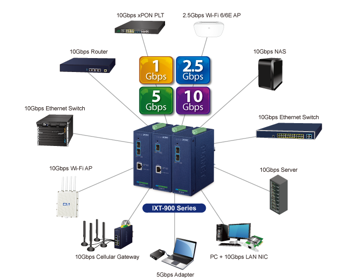 IXT-900-1X1T może osiągać prędkości do 10 Gb/s przez okablowanie miedziane lub światłowodowe, znacznie poprawiając wydajność dużych transmisji danych. Wbudowany miedziany interfejs 10GBASE-T oferuje 5-biegową automatyczną negocjację (10G/5G/2.5G/1G/100) i może przesyłać dane z prędkością 10 Gb/s przez istniejące okablowanie UTP Cat6/Cat6A, eliminując potrzebę kosztownych modernizacji. Dzięki konstrukcji Plug and Play instalacja jest łatwa i bezproblemowa, dzięki czemu możesz cieszyć się potrzebną prędkością bez dodatkowego wysiłku.