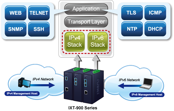 Obsługując zarówno protokoły IPv6, jak i IPv4, IXT-900-1X1T pomaga przedsiębiorstwom i firmom telekomunikacyjnym wkroczyć w erę IPv6 przy najniższych inwestycjach, ponieważ ich obiekty sieciowe nie muszą być wymieniane ani remontowane, jeśli skonfigurowana jest sieć brzegowa IPv6 FTTx.