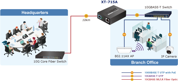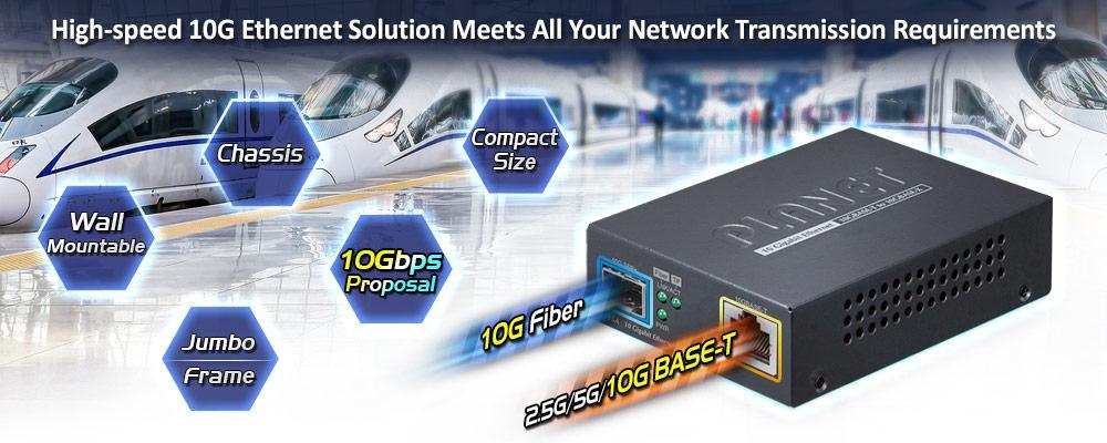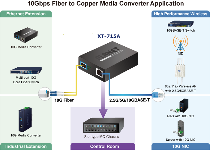 PLANET XT-715A, wykorzystujący standardową technologię Ethernet IEEE 802.3bz/an/ae, jest wyposażony w jeden port automatycznej negocjacji 2.5G/5G/10GBASE-T i jedno gniazdo 10GBASE-X SFP+. Obsługuje konwersję mediów 10Gigabit Ethernet z miedzianego 10GBASE-T na światłowodową transmisję wielomodową lub jednomodową, wykorzystując transceiver 10GBASE-SR lub 10GBASE-LR SFP+ umieszczony w gnieździe SFP+ w celu zwiększenia odległości, na które można dotrzeć do serwerów i przełączników.